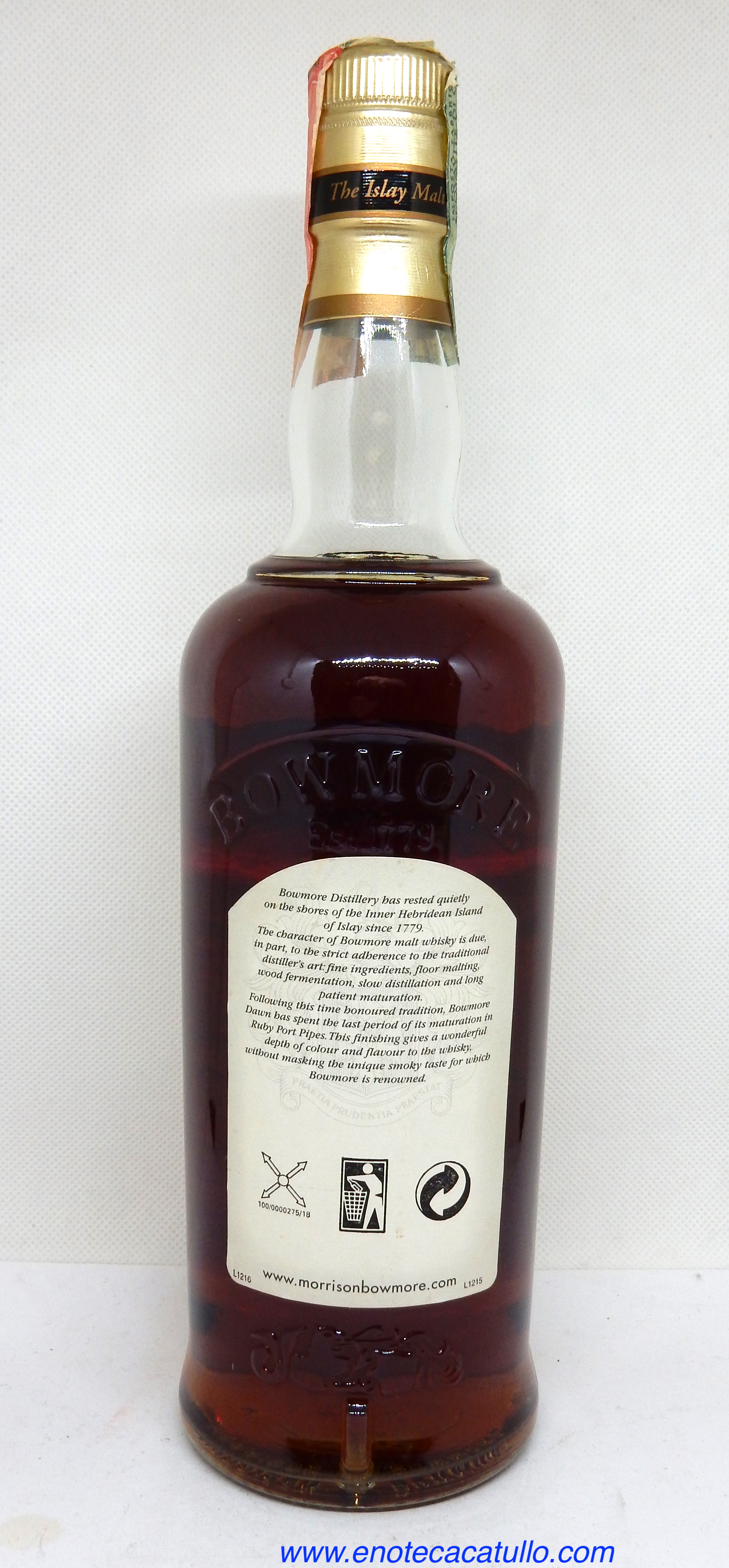 Bowmore Dawn matura inizialmente in botti di ex Bourbon e poi viene affinato in botti selezionate di vino Porto Ruby.