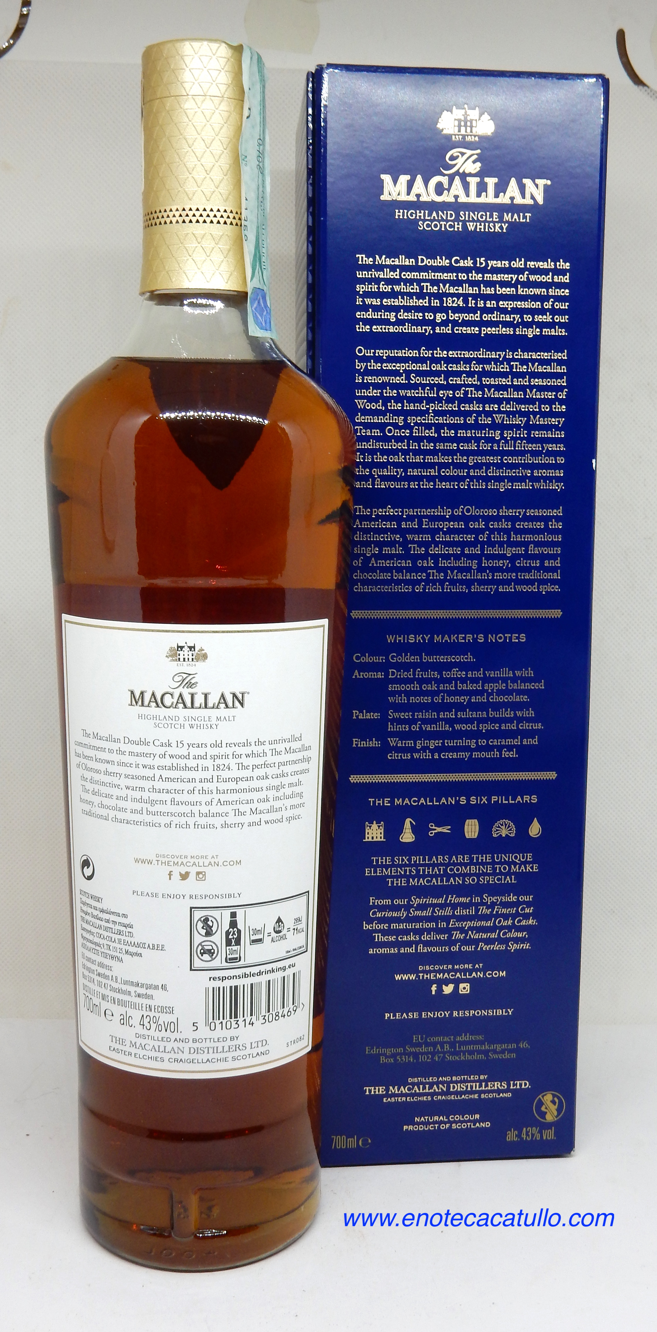 Macallan 15 Years Old Double Cask è un Whisky invecchiato in un misto di botti di rovere americano ed europeo, poi unite in botti ex-sherry Oloroso.