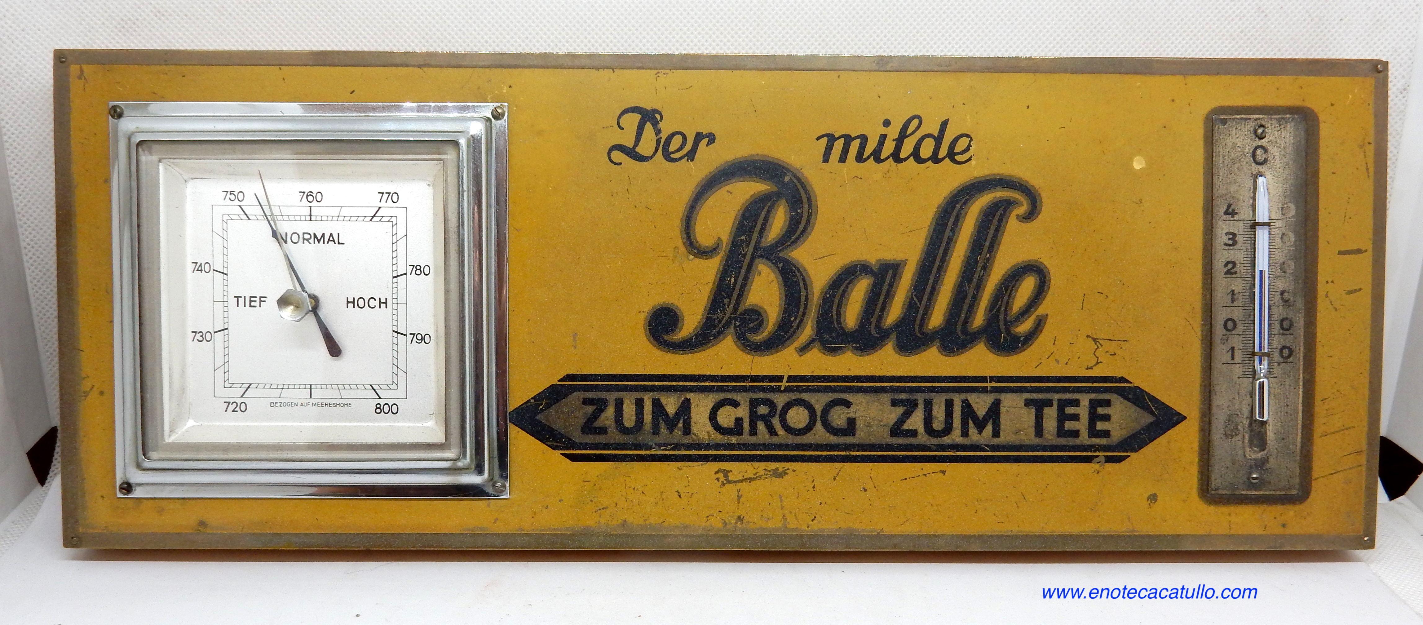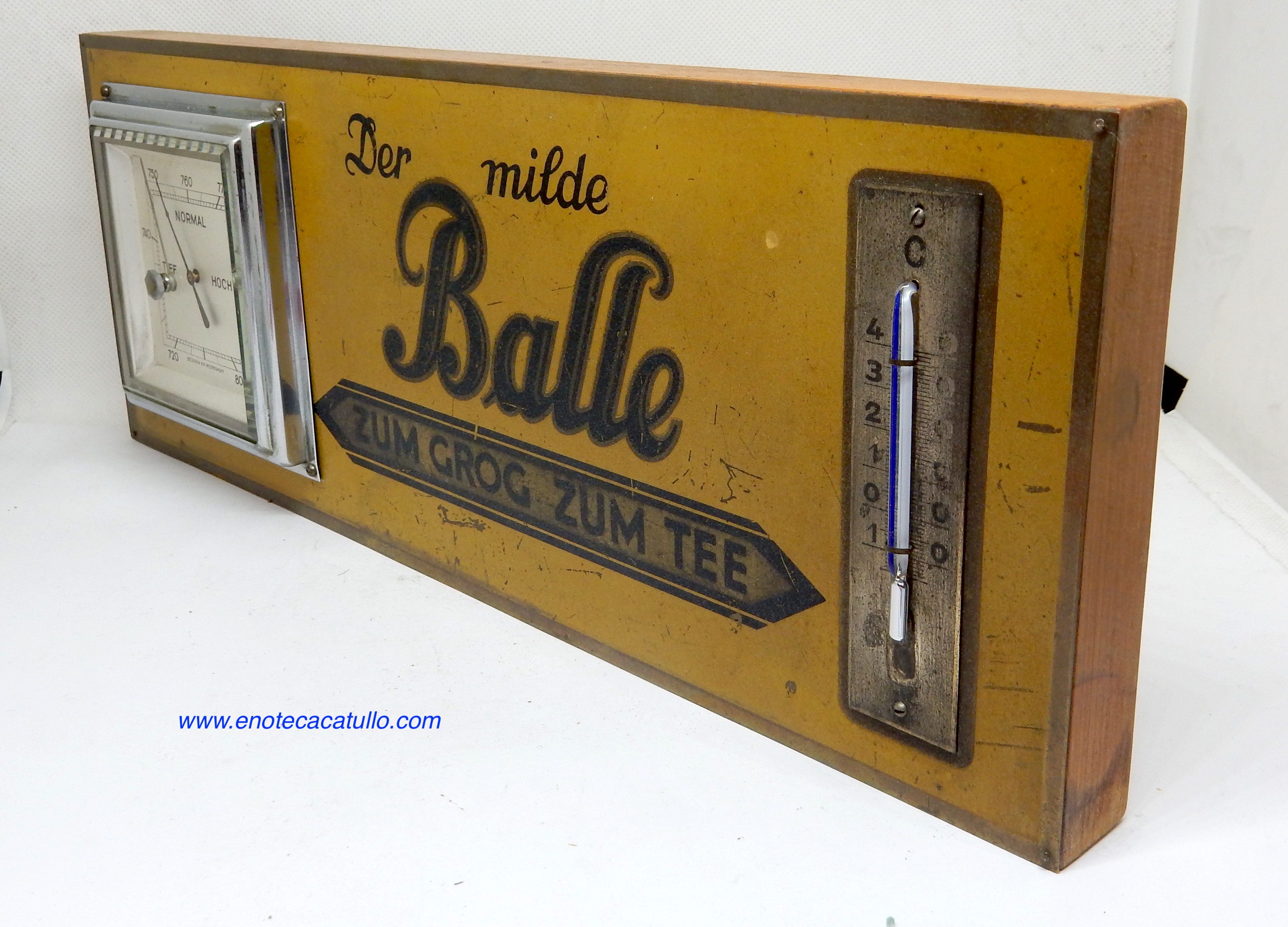 Bellissima e datata stazione meteo pubblicitaria del Rum Balle, con termometro a bulbo funzionante e Barometro.